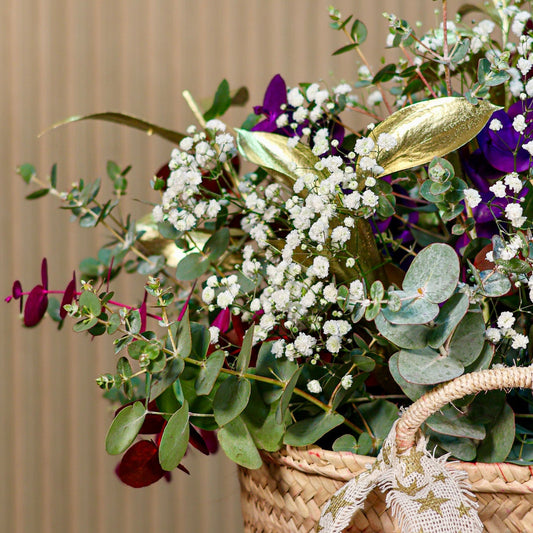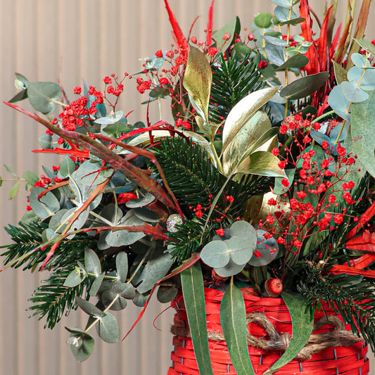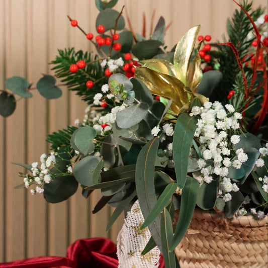 El Pack Regalo Navideño reúne en una sola propuesta los elementos más especiales de la decoración de invierno. Incluye una cesta de mimbre navideña elaborada a mano con abeto natural, ilex rojo, eucalipto y gypsophila blanca, creando una composición cálida y festiva.