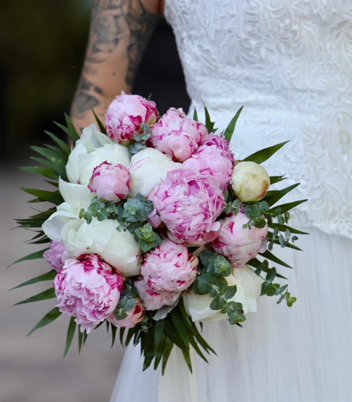 El ramo de novia con peonías rosas y blancas es el favorito de las novias románticas que buscan un estilo natural y elegante para su gran día.